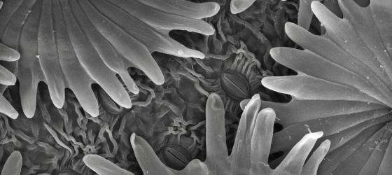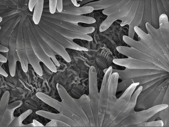 Superficie fogliare di Olea europaea L. 'Lavagnina', che mostra cuticola striata e peli scutati a protezione degli stomi, con la funzione di ridurre un'eccessiva traspirazione (SEM MAG: 2.78kx) - Federica Betuzzi